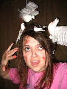 I’m going as Alfred Hitchcock’s “The Birds” for Halloween. All of my creativity for the evening went towards my headpiece for tomorrow.