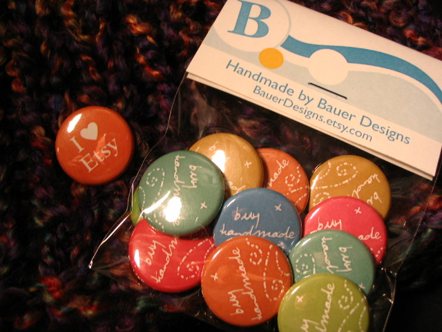 I had recently purchased some felted knitting needle covers from projectfelt on Etsy (http://www.etsy.com/view_transaction.php?transaction_id=6518107) and they came packaged with the cutest 1 inch “Buy Handmade” button. That started me on a mission to find my own “Buy Handmade” buttons. During my quest I not only found the buttons, but also an “I heard Etsy” button and some of the cutest, tiny envelopes with cards perfect for “Thank Yous” with my Etsy orders (purchased from http://www.etsy.com/shop.php?user_id=5274115). I went crazy (but the money comes from PayPal which has come from sales, so it’s not like it is really coming out of my pocket). I can’t wait for my next order to come in so I can package them with this cute button ($15+ in sales of course… the earrings don’t get a button… but 2 pairs of earrings do).