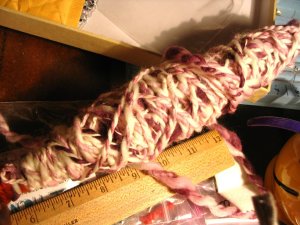 Tomorrow will be spent working on Etsy things, craft show things and some hand spun yarn. I have some delicious wool on its way to me from Hobbledehoy but still have some delicious wool from a previous purchase that needs spinning. My first batch of plied yarn (see above) wasn’t completely horrible. Actually, I like it a lot. It has some parts that are too thick for me but I was learning and I think I know what to do next time to not have those. I absolutely love the colors (my favorite part about it). I bought the roving from Twisted Purl and she’s also helped me out a lot via internet on spinning. I’ve been known to ask her a few questions every now and then and even if she can’t see me in person messing up my yarn, she always tries to answer my questions and I usually come out on the other side with something a bit better than before. She spins as well and her yarn is amazing!