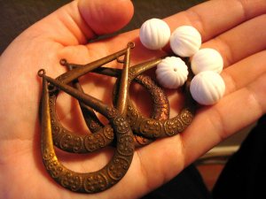 The items pictured above were purchased from ProdigalProgeny on Etsy. I just ordered them the other day and here they are, in my hot little hand (literally). I can’t wait to make them into earrings, beautiful, dangly, attention grabbing earrings. If they don’t sell out at the craft show (which I really hope they do), I’ll have some to list in my Etsy shop starting May 4 along with my new necklaces.