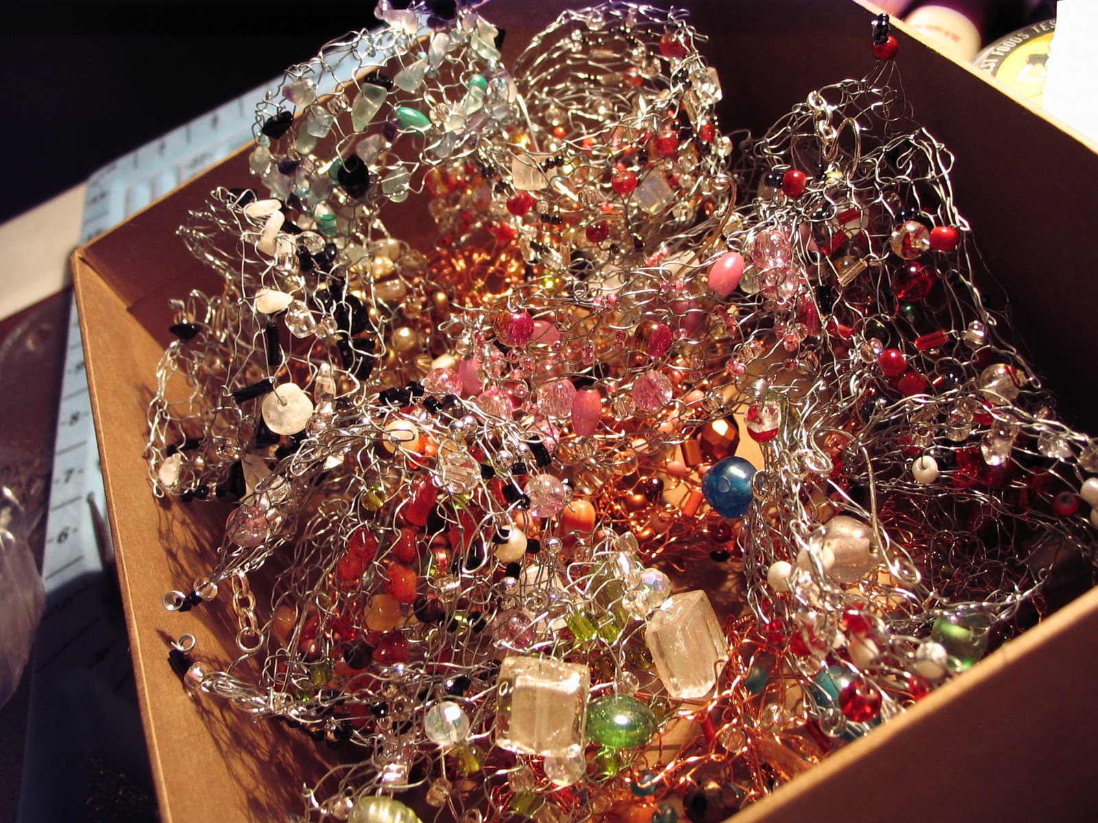 Below is the result of a marathon jewelry making/organizing session. I’ve got 2 days until setting up in my first brick and mortar shop and one of those days is a 12 hour day at work. Guess who’s going to be busy tomorrow? (I do love how flashy those bracelets look piled in a box)
