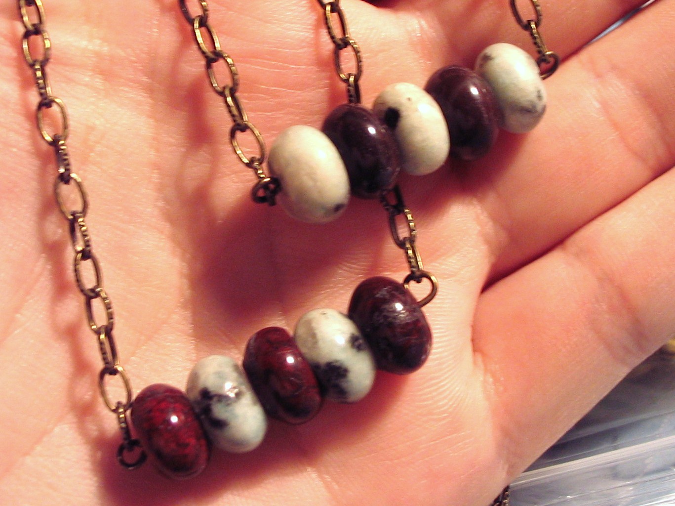 Help! I cannot come up with a name for the necklaces you see above. They are a deep red and a light, mojito green on an antiqued brass chain and I just can’t come up with something appropriate. Here’s where I need your help. I’ll be giving away one of these necklaces to whoever can help me name them. I need to name them by Monday night, June 30 – so you have 2 days. Things to keep in mind when getting creative: