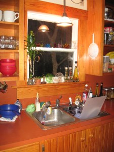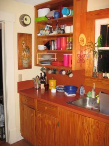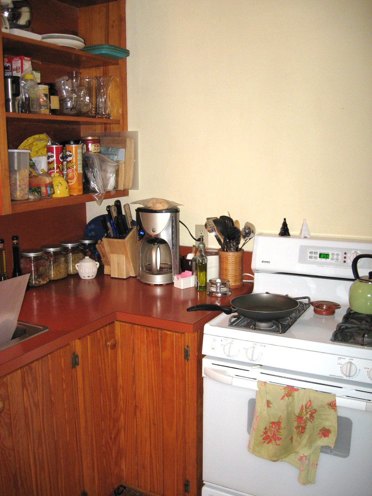 bedroom were built into the attic and the other room (yes, that’s all it had) was surely an original room in the house. Anyways, back to the kitchen, because it was in the old attic, its roof was very sloped and a bit on the short side. Prepping food was always interesting as the counter sat under a roof line that was 4’5″ high (I’m 5’7″, see the problem?). I managed to do all of my prepping and mixing on the top of some Elfa shelves with a top. Yes, small, but functional.