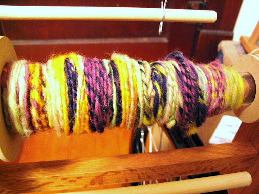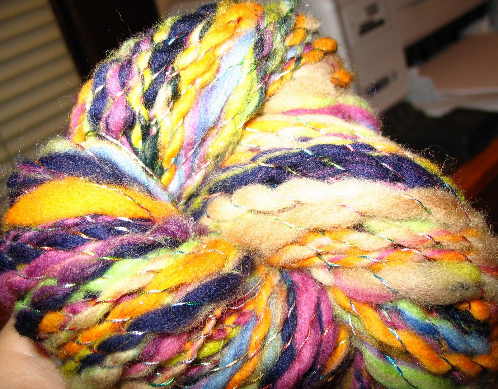 I finished my 2nd skein of yarn tonight. It’s another small one measuring only 39 yards, but I’m still proud of it. I used a bonus batt of wool from Hobbledehoy that she had sent to me with a previous order. Once spun up into a single (see below), I plied it with some rainbow, shimmery thread that a local art teacher gave. So basically it’s a free, practice skein. I couldn’t be happier with my 2nd skein. I can see some things I would do differently next time, but it was practice, and I refuse to be hard on myself.