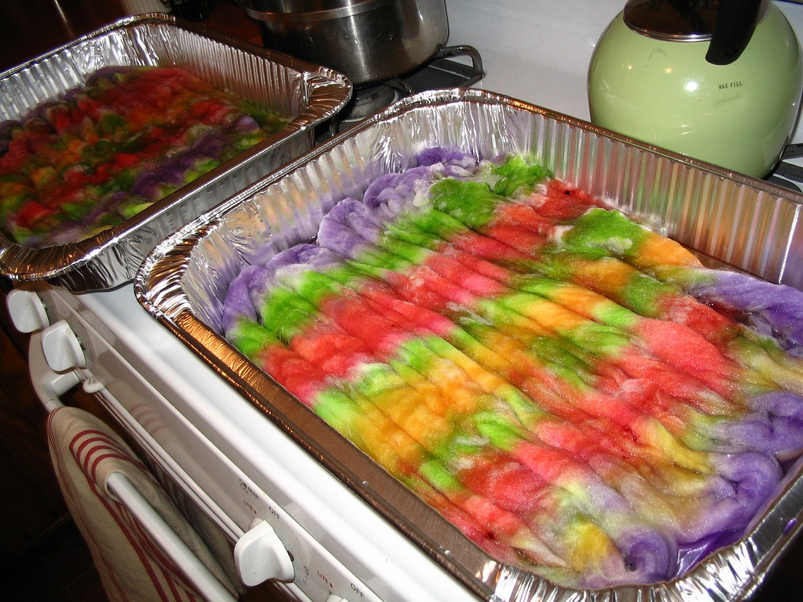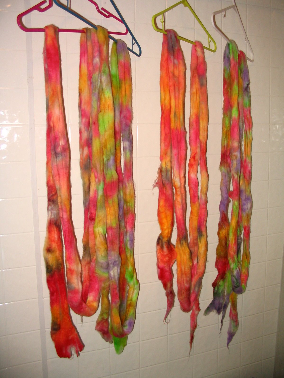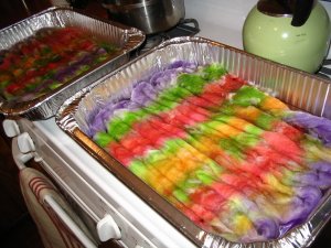 I’m already pleased, not thrilled, but pleased with the turn out. It’s better than I thought it would look for the first go round and I can’t wait to spin some of it up to see how it turned out. It was all I had in my NOT to go and dye all of my wool tonight. I better take this in stages to learn a bit each time.