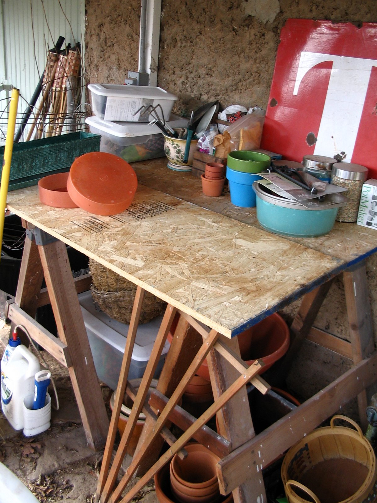 I spent the bulk of this afternoon organizing my gardening area. At my last house I had a great shed (i.e. – weather proof) with a gardeners/potters bench and TONS of shelving. I don’t think I realized how great I had it until I left the shed for the current house. Don’t get me wrong, the house we’re in now is about 59 times more fabulous than the last, but it doesn’t have the shed. It does, however, have 2 saw horses just sitting in the basement, unused, lonely, and sad. So, I pulled them out into the sun light and put a couple of scrap particle board on them and viola – a table to use for my gardening prep area.