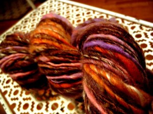 I did some work on it last night, spun some yarn, gave it lots of hugs, and I absolutely love it. It spins VERY well and although it won’t hold as much yarn as my other wheel, I’ll still get a lot of use out of it. I already have this skein of yarn to show off – spun up from some luscious fiber from Hobbledehoy.