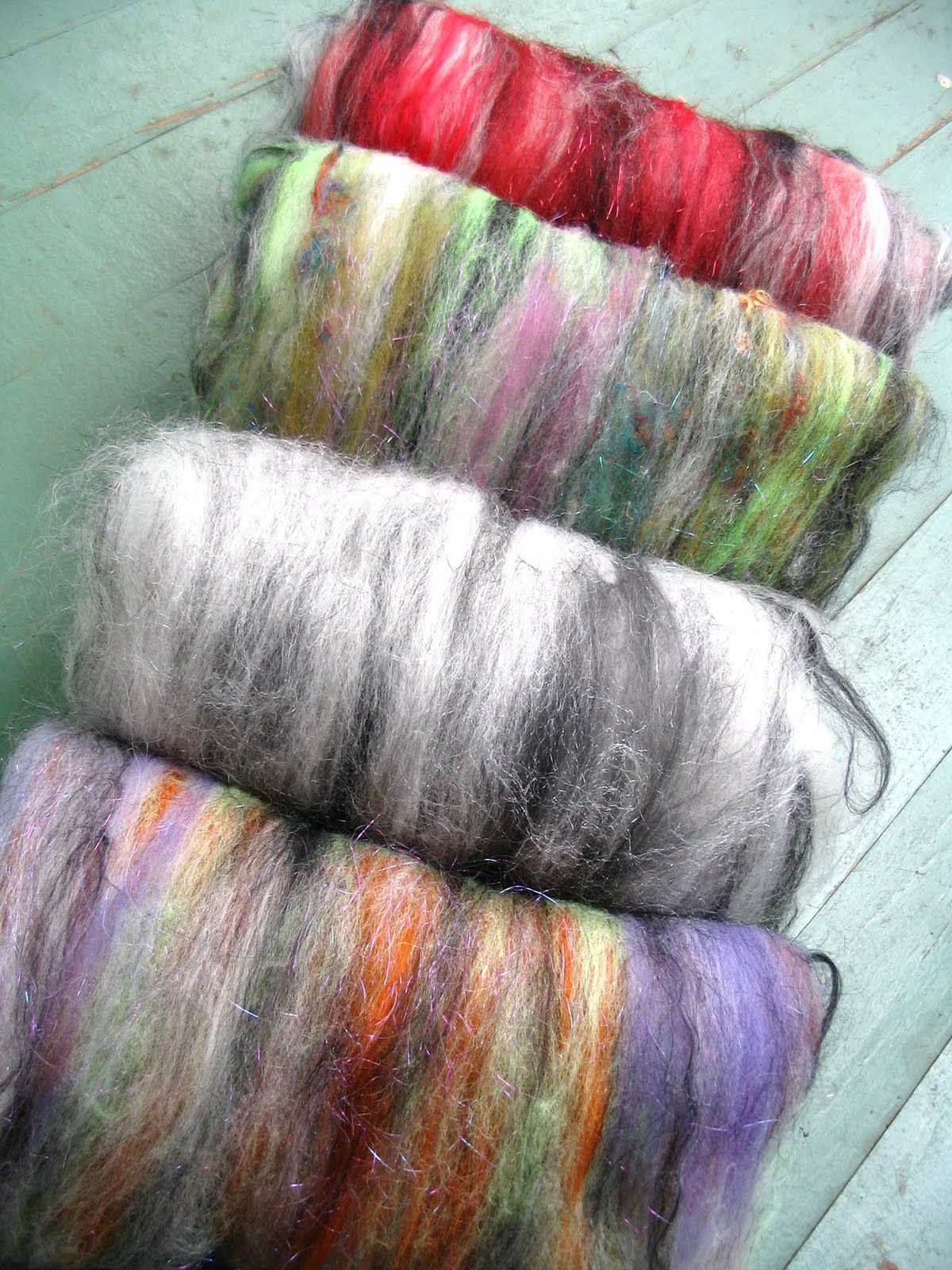 A few posts ago I announced that I’d be hosing my first SAL (spin-a-long) for Woolyhands. The turnout has been great and I can’t wait until the spooky batts make it to their new homes and the creations get posted to my Flickr group. The add ins are a lot of fun and these colors just scream halloween. I thought I’d give you all a sneak preview of each batt and the description that went along with it. They are listed in order from top to bottom in the picture above.