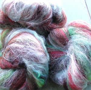 After all is said and done, after I’ve packed up my Farmer’s Market set up for the last time in 2009, after the last Holiday Boutique show has finished, after my last stint pimping my jewelry and yarn to those doing some last minute Holiday shopping, I’ve finally found time for some spinning and fiber prep for my online shop. It’s not that I’ve totally ignored it for the past 6 months, but I certainly haven’t given it the attention it deserves. I took some time to card fibers while waiting on my new wheel to arrive (it’s here – I’m excited, you can go see it over at my Flickr account) and had a sizable update over at Woolyhands today (the favorite of my new batts is pictured above “Frosted Forest”)
