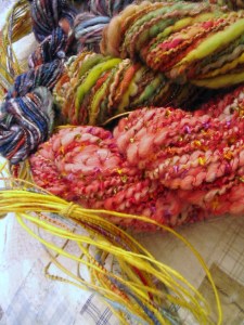 I’ve spun 7 yarns so far. There are plied yarns, singles, crazy art yarns, corespun yarns, corespun on wire yarns, and yarns that have no category. I can’t seem to find the dent I’ve made in my stash yet, but I know it’s there. Hopefully when I get to 10 I’ll have a hole on my bookshelf large enough to have a good reason to go buy more fiber to fill it.
