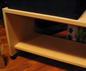 I’m only going to show you a part of the shelf because it is not deserving of being fully presented to the blog world. This shelf… this ugly shelf… this $20 build it yourself shelf… is finally going the way of the yard sale.