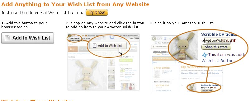 So all of you Amazon junkies (you know who you are) have you seen this? No, your eyes do not deceive you. Amazon has released what they call “Universal Wish List”. This amazing new wish list is a way to add your Etsy favorites (or Art Fire or similar) to your Amazon wish list.