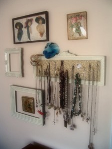 On a side note, I made this necklace hanger before I even moved into this condo but of course, it was never hung until I moved (the story of my life). I found an akwardly wide and short antique frame at the family farm painted silver. A few coats of cream spray paint, some quilt batting and a fat quarter of fabric produced the perfect necklace hanger. My sister gave me some old t-pins and I was set. It looked weird hanging alone, so I painted some other interesting frames the same color and showcased a few, small prints also saved from the family farm. It’s a nice collection and doesn’t look out of place now that my room makes more sense.