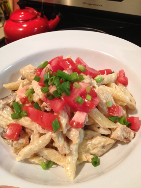 Last night I made it cajun style with some blackened chicken and mushrooms (okay, mushrooms aren’t cajun, but they are good in this pasta) served over penne but I usually use rotini. Is your mouth watering yet? Good, grab a snack and read on.